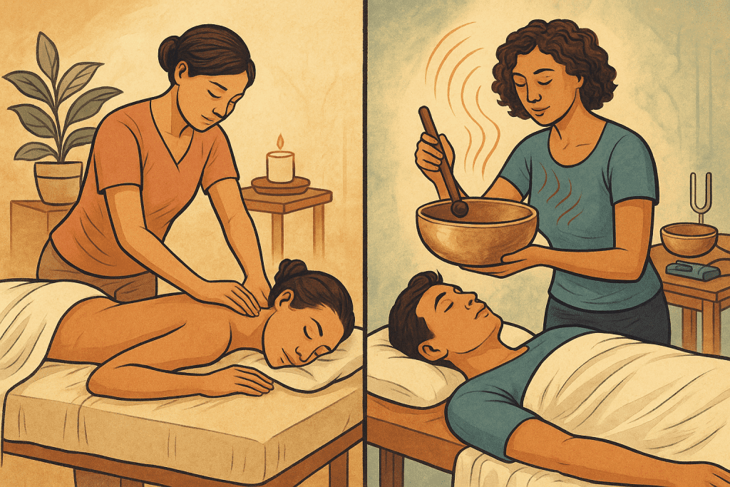 Sound and vibration therapy and traditional massage can both move you toward calm, comfort and better function but they travel different roads. Massage applies skilled, mechanical pressure to mobilize soft tissues and joints. Sound/vibration uses acoustic waves and felt resonance to calm the nervous system and shift body-wide tone with little or no touch. Your best choice depends on your goals, preferences, medical context and how your body responds. Many people get the best of both worlds by combining them priming with sound, resolving with massage, and maintaining with simple at-home practices.
